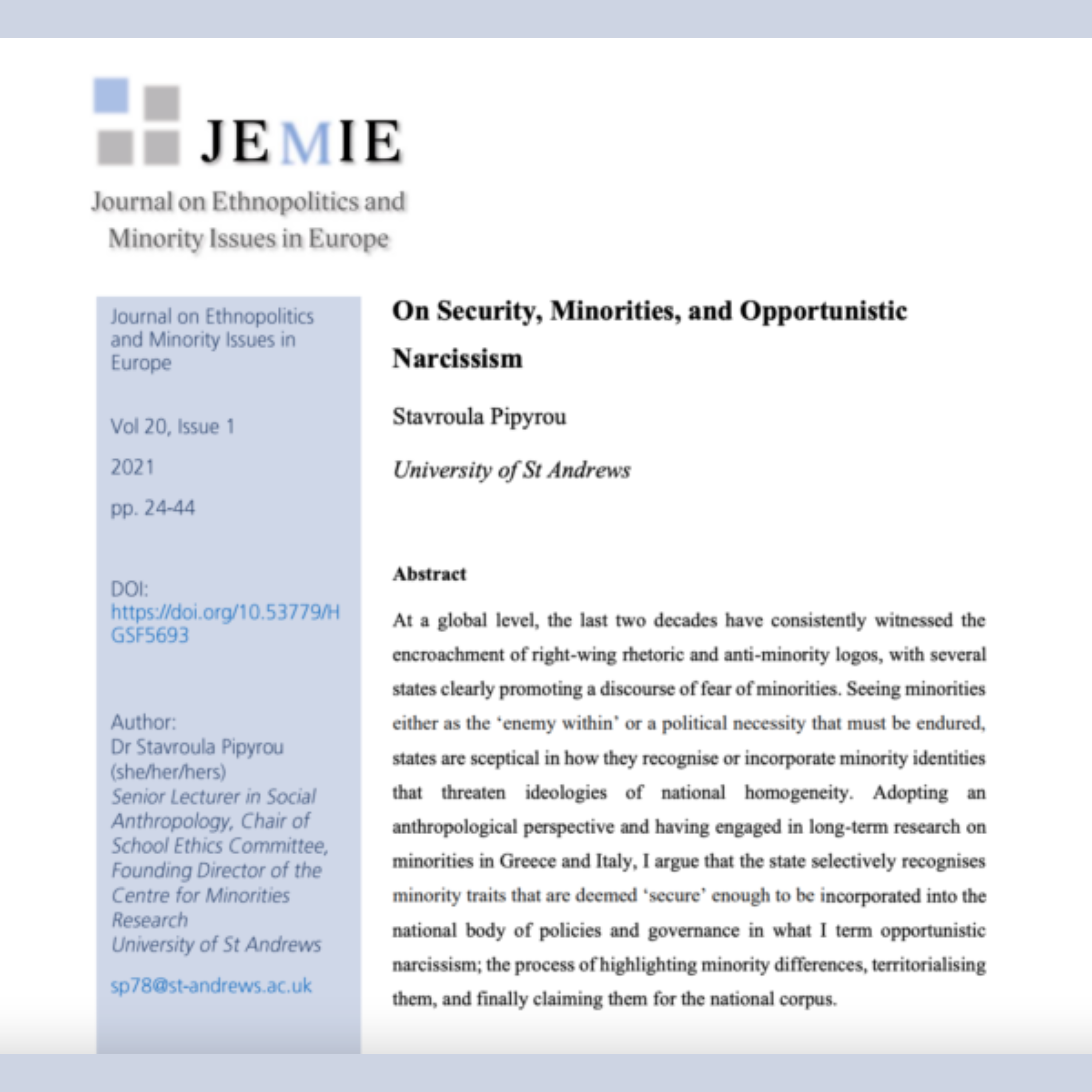 Dr Stavroula Pipyrou, the Centre’s Founding Director, has a new paper On Security, Minorities, and Opportunistic Narcissism, published in the Special Issue of the JEMIE – Journal on Ethnopolitics and Minority Issues in Europe, an ECMI peer-reviewed electronic journal. Read here